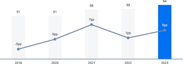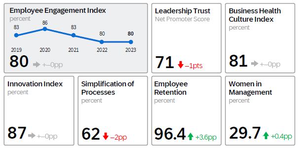 Our Customer Net Promoter Score (NPS) improved 2 points year over year to 9 in 2023, reflecting that customers are increasingly satisfied with our solutions. Meanwhile, our Employee Engagement Index remained stable at 80% and came in at the upper end of our target range, indicating high levels of employee motivation, affinity towards SAP, and excitement about the Company’s future. The proportion of women in management roles increased to 29.7% (2022: 29.4%) and reached 35.2% in the workforce overall.