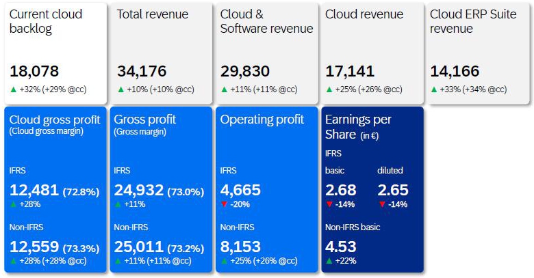 For the full year, cloud revenue was up 25% to €17.14 billion and up 26% at constant currencies. Software licenses revenue was down 21% to €1.40 billion and down 21% at constant currencies. Cloud and software revenue was up 11% to €29.83 billion and up 11% at constant currencies. Services revenue was up 1% to €4.35 billion and up 2% at constant currencies. Total revenue was up 10% to €34.18 billion and up 10% at constant currencies.