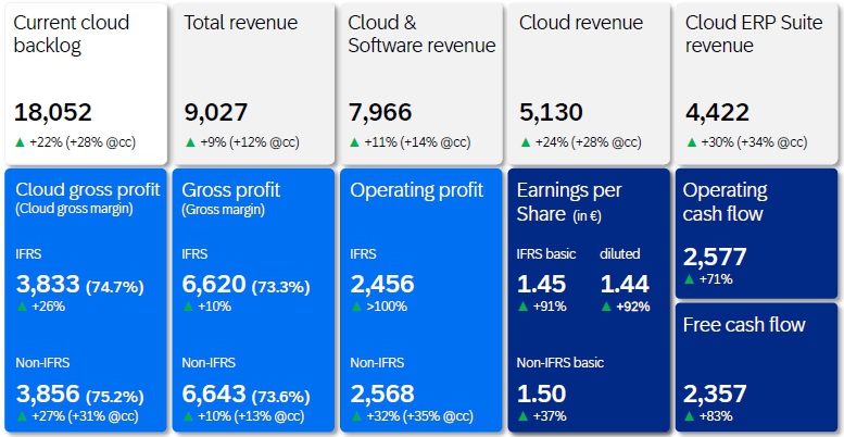 In the second quarter, current cloud backlog grew by 22% to €18.05 billion and was up 28% at constant currencies. Cloud revenue was up 24% to €5.13 billion and up 28% at constant currencies. Cloud ERP Suite revenue was up 30% to €4.42 billion and up 34% at constant currencies.