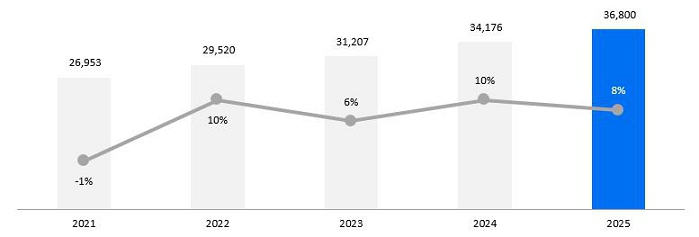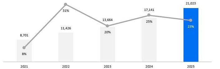 Our Total Cloud Backlog grew by 30%1 to €77 billion in 2025, demonstrating impressive growth on an already large base. Throughout 2025, the Current Cloud Backlog consistently reached growth rates of around 25%1 or more year-on-year. Total Revenue grew by 11%1 and accelerated compared to the previous year. Thanks to our focus on efficiency, including internal AI adoption, Operating Profit increased by 31%2. We achieved a Free Cash Flow of €8.2 billion, nearly doubling year-on-year and demonstrating SAP’s financial strength.