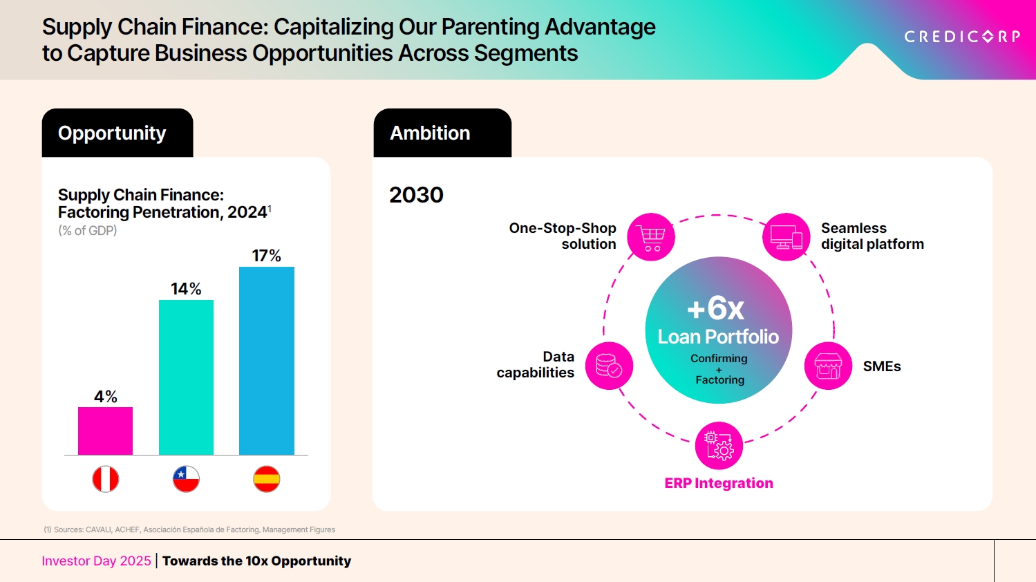 Supply Chain Finance: Capitalizing Our Parenting Advantage to Capture Business Opportunities Across Segments  (1) Sources: CAVALI, ACHEF, Asociación Española de Factoring. Source: Management Figures  Opportunity  Ambition  2030  4%  14%  Supply Chain Finance: Factoring Penetration, 20241  (% of GDP)  17%  +6x  Loan Portfolio  Confirming  +  Factoring  One-Stop-Shop  solution  SMEs  Data capabilities  Seamless  digital platform  ERP Integration  Investor Day 2025 | Towards the 10x Opportunity