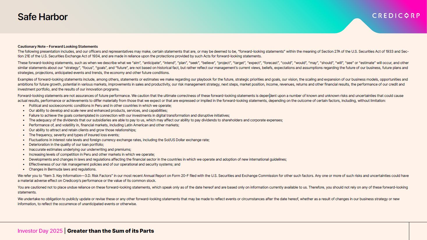 Safe Harbor  Investor Day 2025 | Greater than the Sum of its Parts  Cautionary Note – Forward Looking Statements  The following presentation includes, and our officers and representatives may make, certain statements that are, or may be deemed to be, “forward-looking statements” within the meaning of Section 27A of the U.S. Securities Act of 1933 and Sec- tion 21E of the U.S. Securities Exchange Act of 1934, and are made in reliance upon the protections provided by such Acts for forward-looking statements.  These forward-looking statements, such as when we describe what we “aim”, “anticipate”, “intend”, “plan”, “seek”, “believe”, “project”, “target”, “expect”, “forecast”, “could”, “would”, “may”, “should”, “will”, “see” or “estimate” will occur, and other similar statements about our “strategy”, “focus”, “goals”, and “future”, are not based on historical fact, but rather reflect our managementʼs current views, beliefs, expectations and assumptions regarding the future of our business, future plans and strategies, projections, anticipated events and trends, the economy and other future conditions.  Examples of forward-looking statements include, among others, statements or estimates we make regarding our playbook for the future, strategic priorities and goals, our vision, the scaling and expansion of our business models, opportunities and ambitions for future growth, potential in various markets, improvements in sales and productivity, our risk management strategy, next steps, market position, income, revenues, returns and other financial results, the performance of our credit and  investment portfolio, and the results of our innovation programs.  Forward-looking statements are not assurances of future performance. We caution that the ultimate correctness of these forward-looking statements is dependent upon a number of known and unknown risks and uncertainties that could cause actual results, performance or achievements to differ materially from those that we expect or that are expressed or implied in the forward-looking statements, depending on the outcome of certain factors, including, without limitation:  Political and socioeconomic conditions in Peru and in other countries in which we operate;  Our ability to develop and scale new and enhanced products, services, and capabilities;  Failure to achieve the goals contemplated in connection with our investments in digital transformation and disruptive initiatives;  The adequacy of the dividends that our subsidiaries are able to pay to us, which may affect our ability to pay dividends to shareholders and corporate expenses;  Performance of, and volatility in, financial markets, including Latin American and other markets;  Our ability to attract and retain clients and grow those relationships;  The frequency, severity and types of insured loss events;  Fluctuations in interest rate levels and foreign currency exchange rates, including the Sol/US Dollar exchange rate;  Deterioration in the quality of our loan portfolio;  Inaccurate estimates underlying our underwriting and premiums;  Increasing levels of competition in Peru and other markets in which we operate;  Developments and changes in laws and regulations affecting the financial sector in the countries in which we operate and adoption of new international guidelines;  Effectiveness of our risk management policies and of our operational and security systems; and  Changes in Bermuda laws and regulations.  We refer you to “Item 3. Key Information—3.D. Risk Factors” in our most recent Annual Report on Form 20-F filed with the U.S. Securities and Exchange Commission for other such factors. Any one or more of such risks and uncertainties could have  a material adverse effect on Credicorpʼs performance or the value of its common stock.  You are cautioned not to place undue reliance on these forward-looking statements, which speak only as of the date hereof and are based only on information currently available to us. Therefore, you should not rely on any of these forward-looking statements.  We undertake no obligation to publicly update or revise these or any other forward-looking statements that may be made to reflect events or circumstances after the date hereof, whether as a result of changes in our business strategy or new information, to reflect the occurrence of unanticipated events or otherwise.