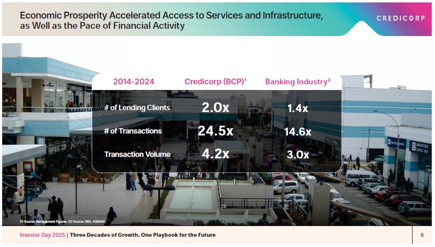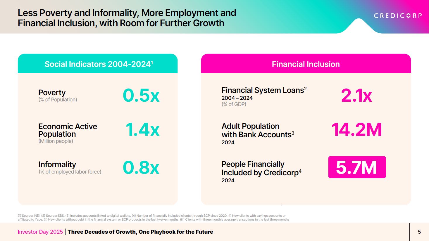 Less Poverty and Informality, More Employment and Financial Inclusion, with Room for Further Growth  Financial Inclusion  Social Indicators 2004-20241  Poverty  (% of Population)  Economic Active Population  (Million people)  0.5x  1.4x  0.8x  Informality  (% of employed labor force)  Financial System Loans2  2004 – 2024  (% of GDP)  Adult Population with Bank Accounts3  2024  People Financially Included by Credicorp4  2024  Investor Day 2025 | Three Decades of Growth, One Playbook for the Future  5  2.1x  14.2M  5.7M  (1) Source: INEI. (2) Source: SBS. (3) Includes accounts linked to digital wallets. (4) Number of financially included clients through BCP since 2020: (i) New clients with savings accounts or affiliated to Yape. (ii) New clients without debt in the financial system or BCP products in the last twelve months. (iii) Clients with three monthly average transactions in the last three months