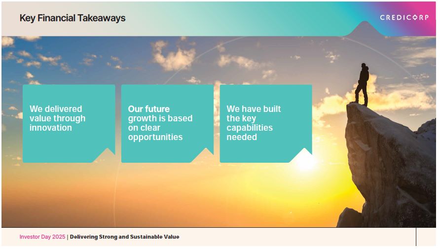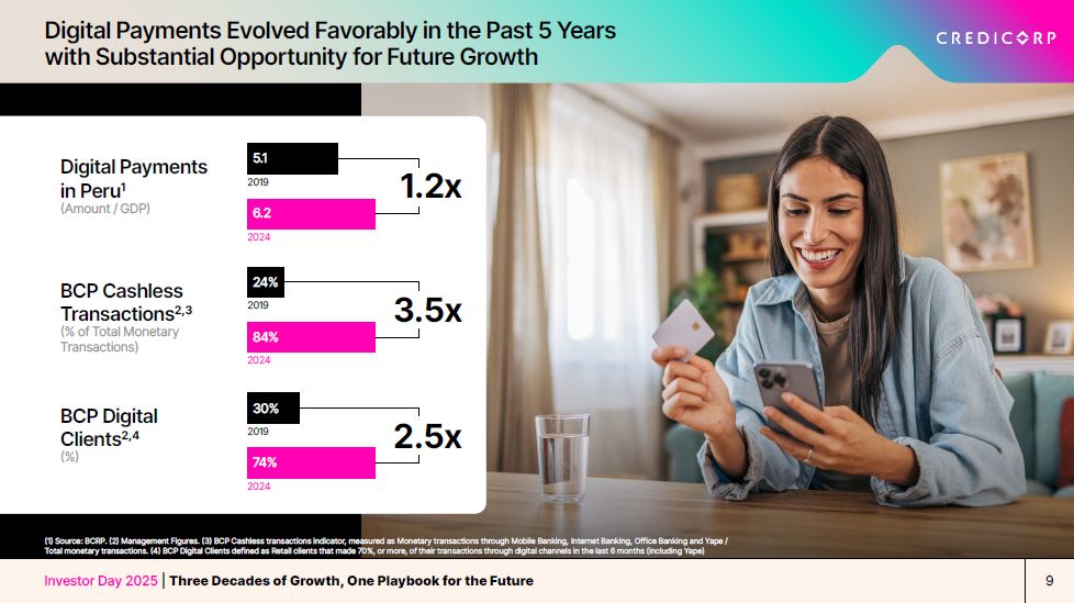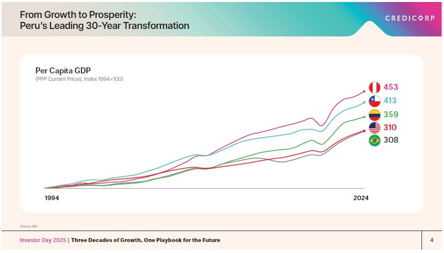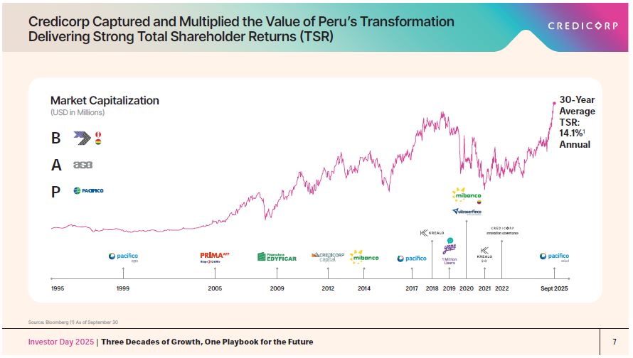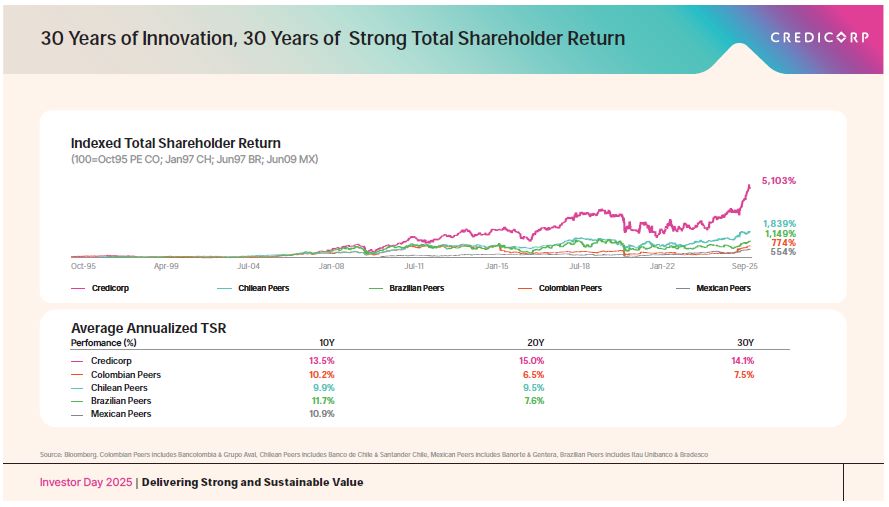 Source: Bloomberg. Colombian Peers includes Bancolombia & Grupo Aval, Chilean Peers includes Banco de Chile & Santander Chile, Mexican Peers includes Banorte & Gentera, Brazilian Peers includes Itau Unibanco & Bradesco  Indexed Total Shareholder Return  (100=Oct95 PE CO; Jan97 CH; Jun97 BR; Jun09 MX)  Oct-95  Apr-99  Jul-04  Jan-08  Jul-11  Jan-15  Jul-18  Jan-22  Sep-25  5,103%  1,839%  1,149%  774%  554%  30 Years of Innovation, 30 Years of Strong Total Shareholder Return  Credicorp  Colombian Peers  Chilean Peers  Brazilian Peers  Mexican Peers  Credicorp Colombian Peers Chilean Peers Brazilian Peers Mexican Peers  Average Annualized TSR  Perfomance (%)  13.5%  10.2%  9.9%  11.7%  10.9%  10Y  20Y  15.0%  6.5%  9.5%  7.6%  14.1%  7.5%  30Y  Investor Day 2025 | Delivering Strong and Sustainable Value
