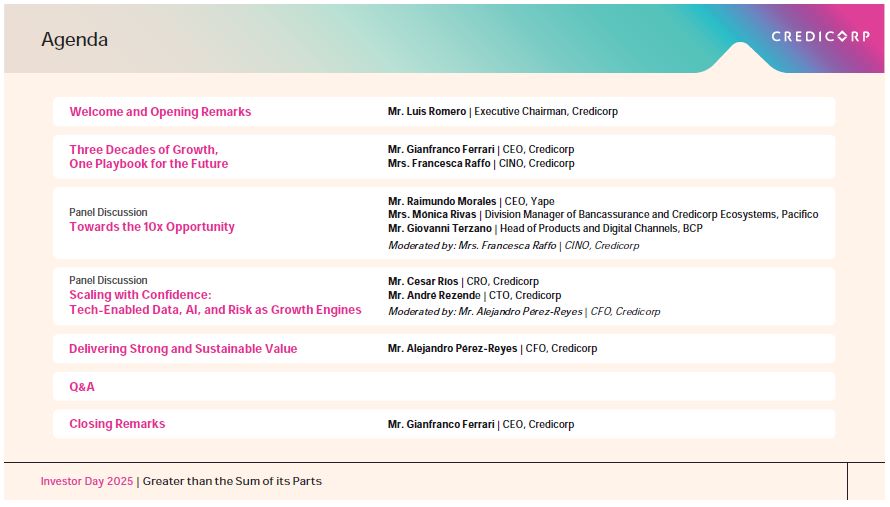 Agenda  Mr. Gianfranco Ferrari | CEO, Credicorp Mrs. Francesca Raffo | CINO, Credicorp  Investor Day 2025 | Greater than the Sum of its Parts  Panel Discussion  Towards the 10x Opportunity  Mr. Gianfranco Ferrari | CEO, Credicorp  Welcome and Opening Remarks  Three Decades of Growth, One Playbook for the Future  Mr. Luis Romero | Executive Chairman, Credicorp  Panel Discussion  Scaling with Confidence:  Tech-Enabled Data, AI, and Risk as Growth Engines  Delivering Strong and Sustainable Value Q&A  Closing Remarks  Mr. Raimundo Morales | CEO, Yape  Mrs. Mónica Rivas | Division Manager of Bancassurance and Credicorp Ecosystems, Pacifico Mr. Giovanni Terzano | Head of Products and Digital Channels, BCP  Moderated by: Mrs. Francesca Raffo | CINO, Credicorp  Mr. Cesar Ríos | CRO, Credicorp  Mr. André Rezende | CTO, Credicorp  Moderated by: Mr. Alejandro Pérez-Reyes | CFO, Credicorp  Mr. Alejandro Pérez-Reyes | CFO, Credicorp