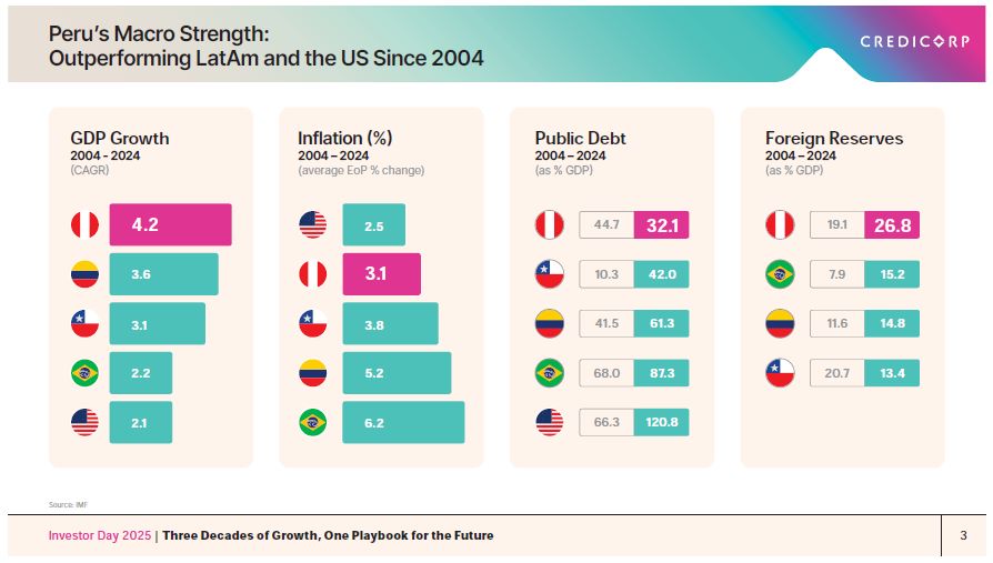 Source: IMF  GDP Growth  2004 - 2024  (CAGR)  Inflation (%)  2004 – 2024  (average EoP % change)  Public Debt  2004 – 2024  (as % GDP)  Foreign Reserves  2004 – 2024  (as % GDP)  Investor Day 2025 | Three Decades of Growth, One Playbook for the Future  3  4.2  2.5  44.7  32.1  19.1  26.8  3.6  3.1  10.3  42.0  7.9  15.2  3.1  3.8  41.5  61.3  11.6  14.8  2.2  5.2  68.0  87.3  20.7  13.4  2.1  6.2  66.3  120.8  Peruʼs Macro Strength:  Outperforming LatAm and the US Since 2004