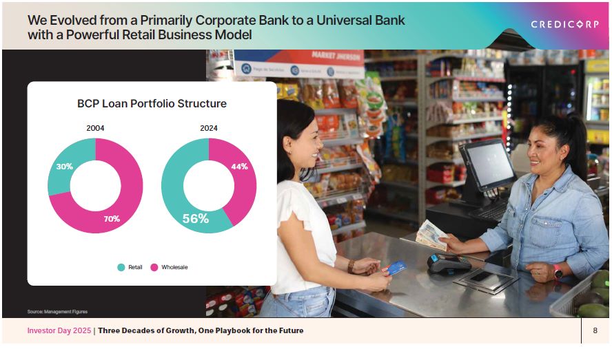 We Evolved from a Primarily Corporate Bank to a Universal Bank with a Powerful Retail Business Model  Source: Management Figures  BCP Loan Portfolio Structure  Retail  Wholesale  2004  Investor Day 2025 | Three Decades of Growth, One Playbook for the Future  8  2024  30%  70%  44%  56%