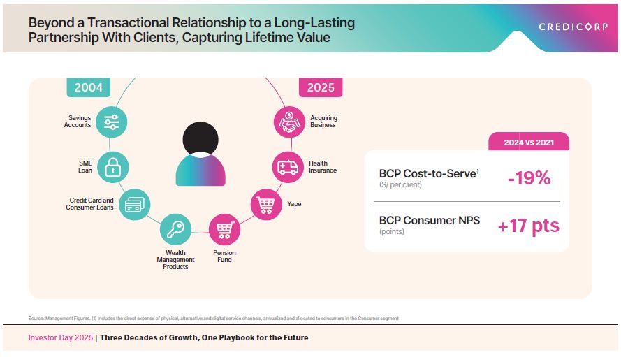 Beyond a Transactional Relationship to a Long-Lasting Partnership With Clients, Capturing Lifetime Value  Source: Management Figures. (1) Includes the direct expense of physical, alternative and digital service channels, annualized and allocated to consumers in the Consumer segment  BCP Cost-to-Serve1  (S/ per client)  -19%  BCP Consumer NPS  (points)  +17 pts  Health Insurance  Wealth Management Products  Acquiring Business  SME  Loan  Credit Card and Consumer Loans  Yape  Pension Fund  2024 vs 2021  Savings Accounts  2004  2025  Investor Day 2025 | Three Decades of Growth, One Playbook for the Future