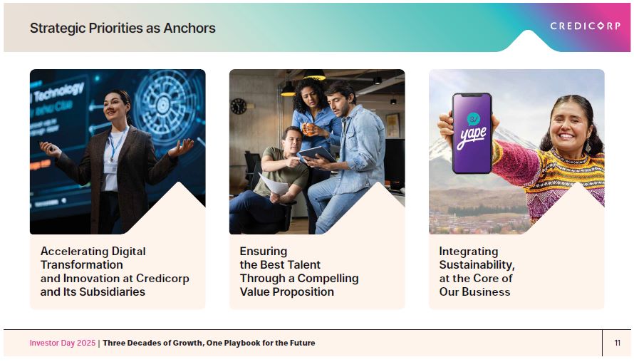 Strategic Priorities as Anchors  Accelerating Digital Transformation  and Innovation at Credicorp and Its Subsidiaries  Integrating Sustainability, at the Core of Our Business  Ensuring  the Best Talent Through a Compelling Value Proposition  Investor Day 2025 | Three Decades of Growth, One Playbook for the Future  11