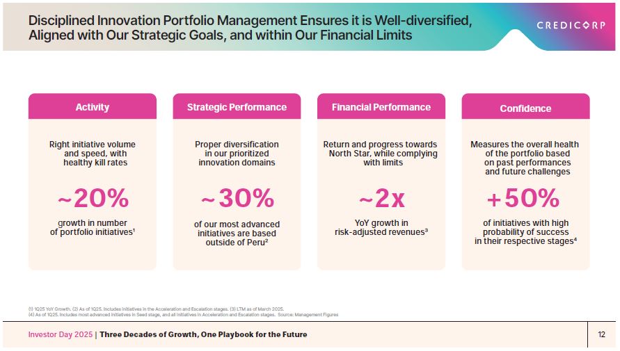 Disciplined Innovation Portfolio Management Ensures it is Well-diversified, Aligned with Our Strategic Goals, and within Our Financial Limits  (1) 1Q25 YoY Growth. (2) As of 1Q25. Includes initiatives in the Acceleration and Escalation stages. (3) LTM as of March 2025.  (4) As of 1Q25. Includes most advanced initiatives in Seed stage, and all initiatives in Acceleration and Escalation stages. Source: Management Figures  Strategic Performance  Proper diversification in our prioritized  innovation domains  ~30%  of our most advanced initiatives are based  outside of Peru2  Activity  Right initiative volume and speed, with  healthy kill rates  ~20%  growth in number  of portfolio initiatives1  Financial Performance  Return and progress towards North Star, while complying  with limits  ~2x  YoY growth in  risk-adjusted revenues3  Measures the overall health of the portfolio based  on past performances and future challenges  +50%  of initiatives with high probability of success  in their respective stages4  Confidence  Investor Day 2025 | Three Decades of Growth, One Playbook for the Future  12