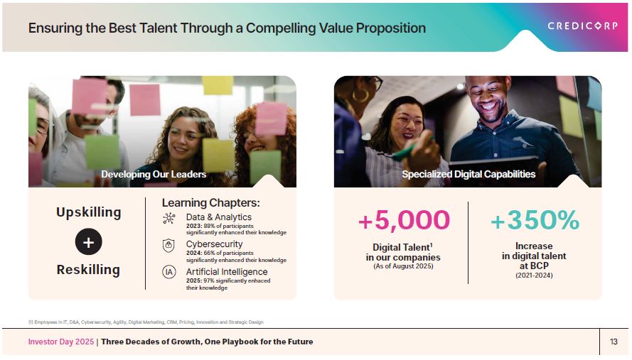 Ensuring the Best Talent Through a Compelling Value Proposition  (1) Employees in IT, D&A, Cybersecurity, Agility, Digital Marketing, CRM, Pricing, Innovation and Strategic Design  Upskilling  +  Reskilling  Developing Our Leaders  Specialized Digital Capabilities  +350%  Increase  in digital talent at BCP  (2021-2024)  Investor Day 2025 | Three Decades of Growth, One Playbook for the Future  13  +5,000  Digital Talent1  in our companies  (As of August 2025)  Learning Chapters:  Data & Analytics  2023: 88% of participants  significantly enhanced their knowledge  Cybersecurity  2024: 66% of participants  significantly enhanced their knowledge  IA Artificial Intelligence  2025: 97% significantly enhaced their knowledge