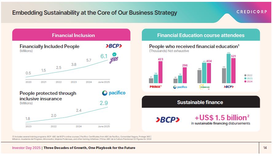 Embedding Sustainability at the Core of Our Business Strategy  Financial Education course attendees  Sustainable finance  Financial Inclusion  Financially Included People  (Millions)  2.9  People protected through inclusive insurance  (Millions)  2.4  2.0  1.8  2023 2022 2024  2022  2023  2020  2021  0.5  1.5  2.5  3.8  5.7  6.1  2024  June 2025  June 2025  (1) Includes several training programs: BCP: ABC del BCPʼs online courses | Pacifico: Certificates from ABC de Pacífico, Comunidad Segura, Protege 365 | Mibanco: Academia del Progreso, Miconsultor, Mujeres Poderosas, and other training initiatives | Prima: ABC de la Cultura Previsional (2) Figures for 2024  People who received financial education1  (Thousands) Not exhaustive  2022  2023  2024  310  614  521  48  115  296  251  413 404  61  138  423  +US$ 1.5 billion2  in sustainable financing disbursements  Investor Day 2025 | Three Decades of Growth, One Playbook for the Future  14