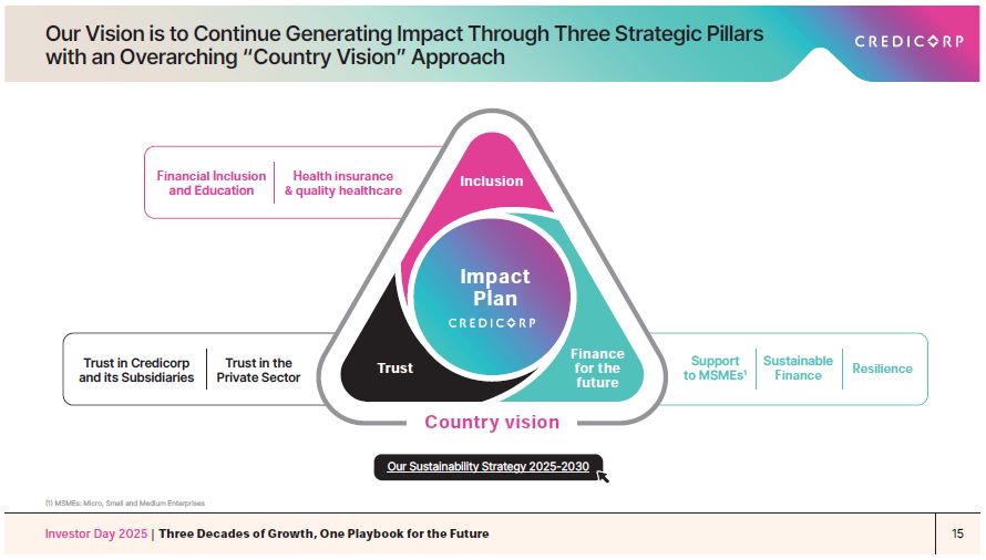 Our Vision is to Continue Generating Impact Through Three Strategic Pillars with an Overarching “Country Vision” Approach  (1) MSMEs: Micro, Small and Medium Enterprises  Financial Inclusion and Education  Health insurance & quality healthcare  Trust in Credicorp and its Subsidiaries  Trust in the Private Sector  Support to MSMEs1  Sustainable Finance  Resilience  Our Sustainability Strategy 2025-2030  Finance for the future  Inclusion  Country vision  Trust  Impact Plan  Investor Day 2025 | Three Decades of Growth, One Playbook for the Future  15