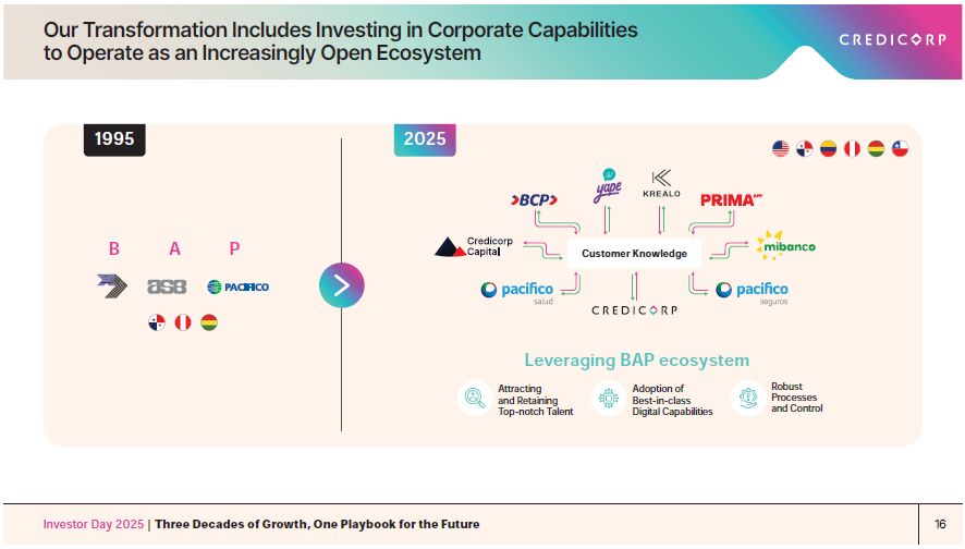 Our Transformation Includes Investing in Corporate Capabilities to Operate as an Increasingly Open Ecosystem  1995  2025  Leveraging BAP ecosystem  Attracting and Retaining  Top-notch Talent  Adoption of Best-in-class  Digital Capabilities  Investor Day 2025 | Three Decades of Growth, One Playbook for the Future  16  Robust Processes and Control  B  A  P  Customer Knowledge