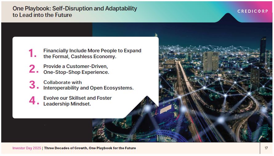 One Playbook: Self-Disruption and Adaptability to Lead into the Future  Financially Include More People to Expand the Formal, Cashless Economy.  Provide a Customer-Driven, One-Stop-Shop Experience.  Collaborate with  Interoperability and Open Ecosystems.  Evolve our Skillset and Foster Leadership Mindset.  Investor Day 2025 | Three Decades of Growth, One Playbook for the Future  17  1.  2.  3.  4.