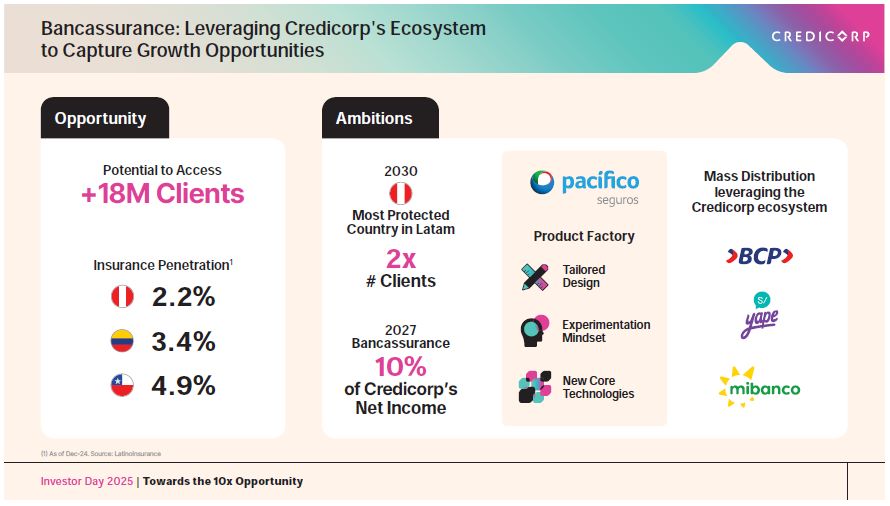 Bancassurance: Leveraging Credicorp’s Ecosystem to Capture Growth Opportunities  (1) As of Dec-24. Source: LatinoInsurance  Opportunity  Potential to Access  +18M Clients  Insurance Penetration1  2.2%  3.4%  4.9%  Ambitions  2027  Bancassurance  10%  of Credicorpʼs  Net Income  Mass Distribution leveraging the Credicorp ecosystem  Product Factory  Tailored Design  Experimentation Mindset  New Core Technologies  2030  Most Protected Country in Latam  2x  # Clients  Investor Day 2025 | Towards the 10x Opportunity