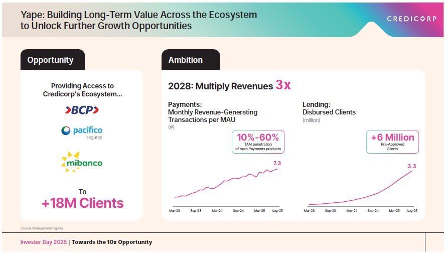 Yape: Building Long-Term Value Across the Ecosystem to Unlock Further Growth Opportunities  Source: Management Figures  Opportunity  Ambition  Providing Access to  Credicorpʼs Ecosystem…  To  +18M Clients  Mar-23  Sep-23  Mar-24  Sep-24  Mar-25  Aug-25  2028: Multiply Revenues 3x  Payments:  Monthly Revenue-Generating Transactions per MAU  (#)  7.3  10%-60%  TAM penetration  of main Payments products  Lending: Disbursed Clients  (million)  3.3  +6 Million  Pre-Approved Clients  Mar-23  Investor Day 2025 | Towards the 10x Opportunity  Sep-23  Mar-24  Sep-24  Mar-25  Aug-25