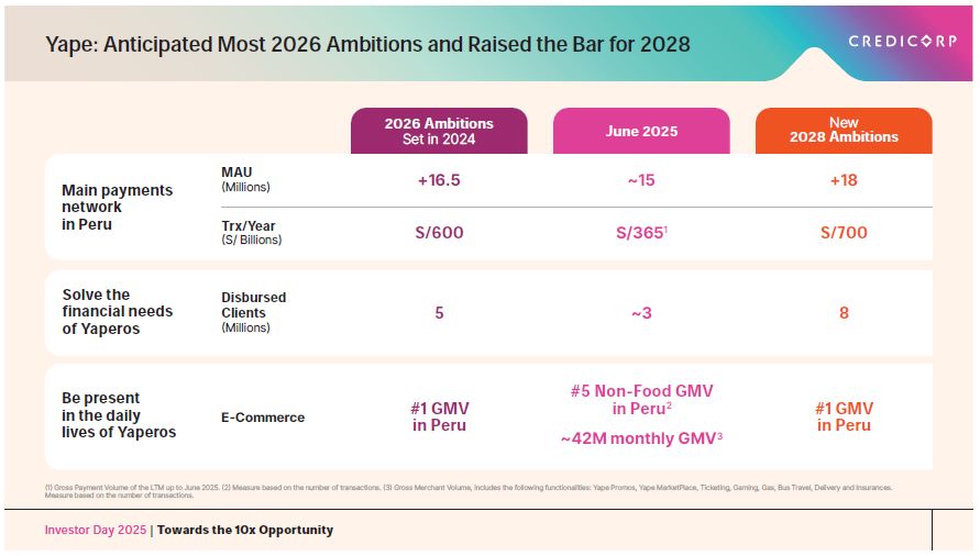 (1) Gross Payment Volume of the LTM up to June 2025. (2) Measure based on the number of transactions. (3) Gross Merchant Volume, includes the following functionalities: Yape Promos, Yape MarketPlace, Ticketing, Gaming, Gas, Bus Travel, Delivery and Insurances. Measure based on the number of transactions.  2026 Ambitions  Set in 2024  June 2025  New  2028 Ambitions  Solve the  financial needs of Yaperos  Disbursed Clients (Millions)  5  ~3  8  Main payments network  in Peru  Be present in the daily  lives of Yaperos  E-Commerce  #1 GMV  in Peru  #5 Non-Food GMV in Peru2  ~42M monthly GMV3  #1 GMV  in Peru  MAU  (Millions)  Trx/Year  (S/ Billions)  +16.5  S/600  ~15  S/3651  +18  S/700  Yape: Anticipated Most 2026 Ambitions and Raised the Bar for 2028  Investor Day 2025 | Towards the 10x Opportunity