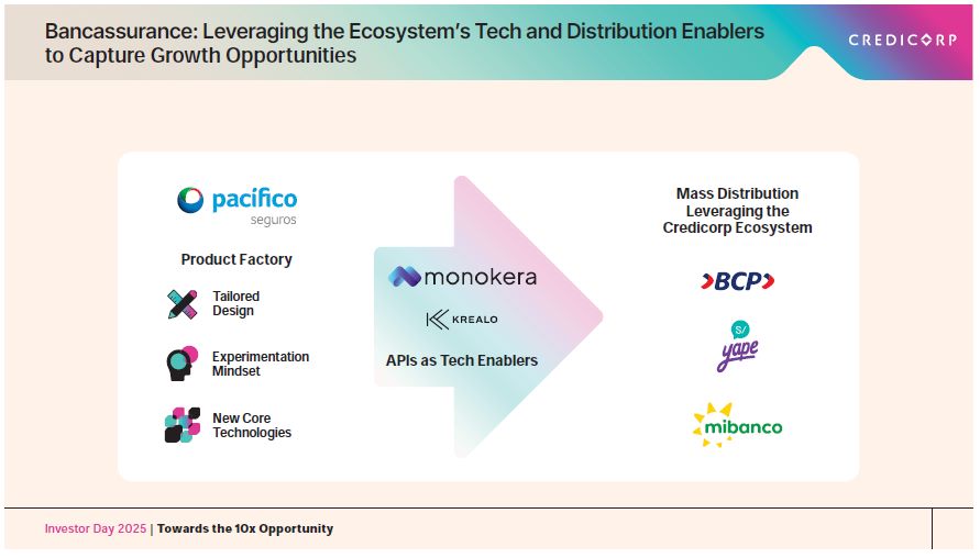 Bancassurance: Leveraging the Ecosystemʼs Tech and Distribution Enablers  to Capture Growth Opportunities  Product Factory  Tailored Design  Experimentation Mindset  New Core Technologies  Mass Distribution Leveraging the Credicorp Ecosystem  APIs as Tech Enablers  Investor Day 2025 | Towards the 10x Opportunity