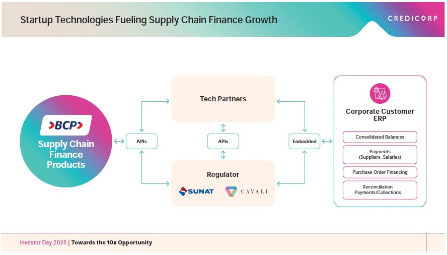Startup Technologies Fueling Supply Chain Finance Growth  Supply Chain Finance Products  Tech Partners  Regulator  Corporate Customer ERP  Consolidated Balances  Purchase Order Financing  Payments  (Suppliers, Salaries)  Reconciliation Payments/Collections  Embedded  APIs  APIs  Investor Day 2025 | Towards the 10x Opportunity