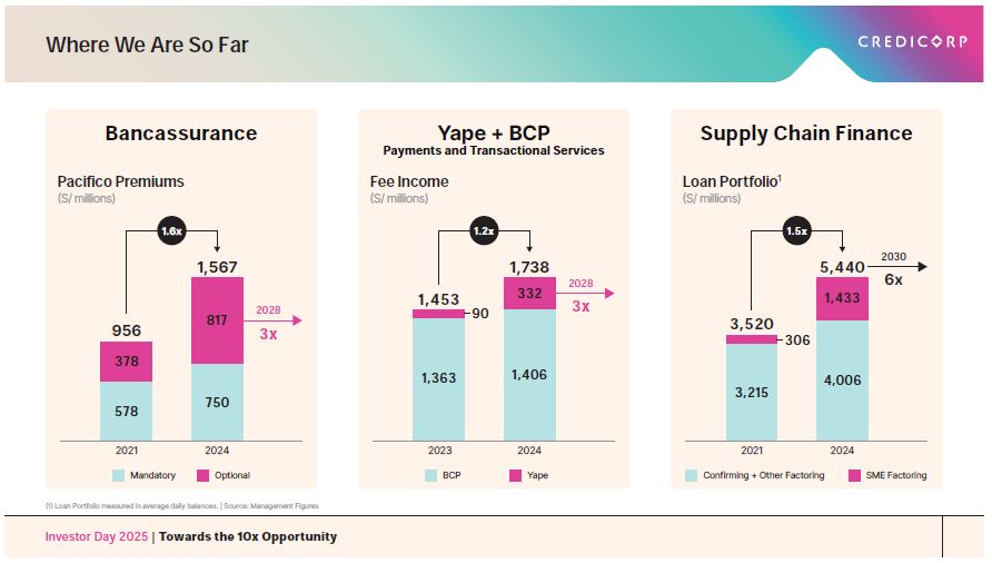 Where We Are So Far  (1) Loan Portfolio measured in average daily balances. | Source: Management Figures  Bancassurance  Pacifico Premiums  (S/ millions)  578  378  2021  750  817  2024  3x  2028  956  1,567  Mandatory  Optional  1.6x  Supply Chain Finance  Loan Portfolio1  (S/ millions)  2021  2024  3,215  4,006  1,433  306  3,520  5,440  1.5x  6x  2030  1,363  90  2023  1,406  332  2024  1,453  1,738  BCP  Yape  Yape + BCP  Payments and Transactional Services  Fee Income  (S/ millions)  1.2x  3x  2028  Confirming + Other Factoring  SME Factoring  Investor Day 2025 | Towards the 10x Opportunity