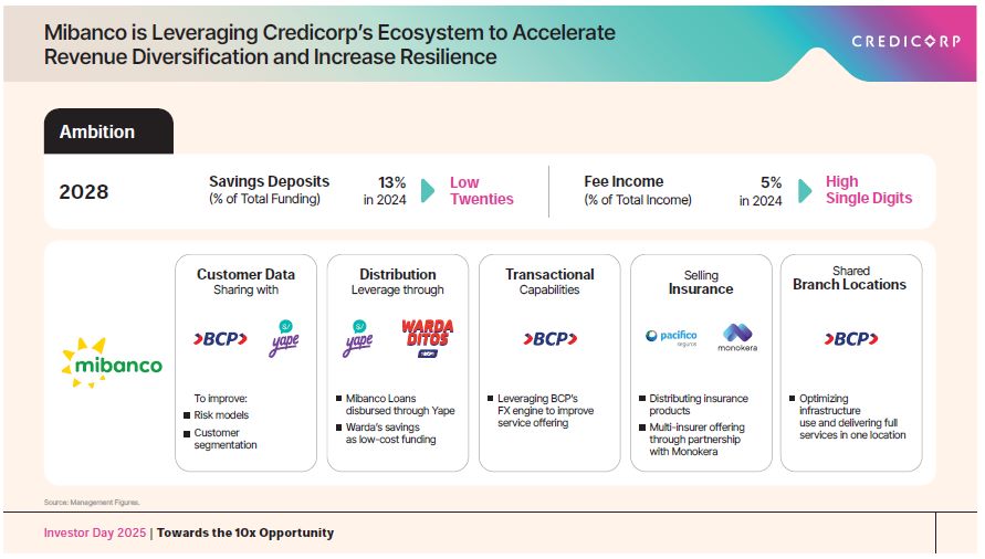 Mibanco is Leveraging Credicorpʼs Ecosystem to Accelerate Revenue Diversification and Increase Resilience  Source: Management Figures.  Ambition  2028  Savings Deposits  (% of Total Funding)  13%  in 2024  Low Twenties  Fee Income  (% of Total Income)  5%  in 2024  High  Single Digits  Customer Data  Sharing with  Distribution  Leverage through  Transactional  Capabilities  Selling  Insurance  Shared  Branch Locations  To improve:  Risk models  Customer segmentation  Mibanco Loans disbursed through Yape  Wardaʼs savings  as low-cost funding  Distributing insurance products  Multi-insurer offering through partnership with Monokera  Leveraging BCPʼs  FX engine to improve service offering  Optimizing infrastructure  use and delivering full  services in one location  Investor Day 2025 | Towards the 10x Opportunity