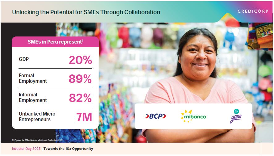 GDP  20%  Formal Employment  89%  Informal Employment  82%  Unbanked Micro Entrepreneurs  7M  SMEs in Peru represent1  Unlocking the Potential for SMEs Through Collaboration  (1) Figures for 2024. Source: Ministry of Production, INEI  Investor Day 2025 | Towards the 10x Opportunity