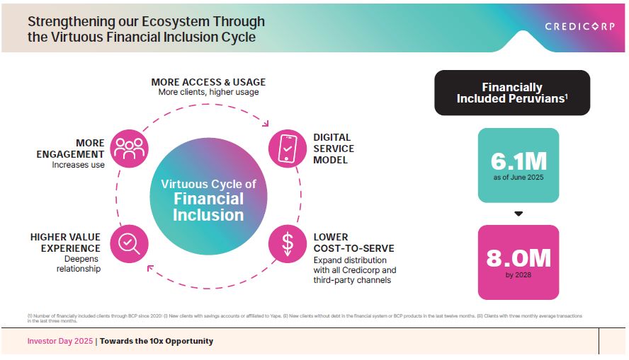 Strengthening our Ecosystem Through the Virtuous Financial Inclusion Cycle  Virtuous Cycle of  Financial Inclusion  MORE ACCESS & USAGE  More clients, higher usage  DIGITAL SERVICE MODEL  MORE ENGAGEMENT  Increases use  HIGHER VALUE EXPERIENCE  Deepens  relationship  LOWER  COST-TO-SERVE  Expand distribution with all Credicorp and third-party channels  Financially  Included Peruvians1  8.0M  by 2028  6.1M  as of June 2025  (1) Number of financially included clients through BCP since 2020: (i) New clients with savings accounts or affiliated to Yape. (ii) New clients without debt in the financial system or BCP products in the last twelve months. (iii) Clients with three monthly average transactions in the last three months.  Investor Day 2025 | Towards the 10x Opportunity