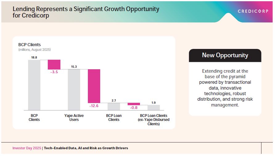 New Opportunity  Extending credit at the base of the pyramid powered by transactional data, innovative technologies, robust  distribution, and strong risk  management.  BCP Clients  (millions, August 2025)  BCP  Clients  Yape Active Users  BCP Loan Clients  BCP Loan Clients (ex-Yape Disbursed Clients)  18.8  -3.5  15.3  2.7  1.9  -12.6  -0.8  Lending Represents a Significant Growth Opportunity for Credicorp  Investor Day 2025 | Tech-Enabled Data, AI and Risk as Growth Drivers
