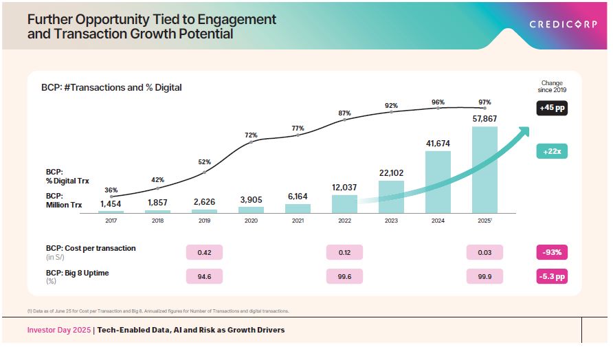 0.42  94.6  0.12  99.6  0.03  99.9  BCP: Cost per transaction  (in S/)  BCP: Big 8 Uptime  (%)  2017  1,454  2018  1,857  2019  2,626  3,905  2020  6,164  2021  12,037  2022  22,102  2023  41,674  2024  57,867  20251  36%  42%  52%  77%  72%  87%  92%  96%  97%  BCP:  % Digital Trx  BCP:  Million Trx  -93%  +22x  -5.3 pp  Change  since 2019  BCP: #Transactions and % Digital  +45 pp  (1) Data as of June 25 for Cost per Transaction and Big 8. Annualized figures for Number of Transactions and digital transactions.  Investor Day 2025 | Tech-Enabled Data, AI and Risk as Growth Drivers  Further Opportunity Tied to Engagement and Transaction Growth Potential