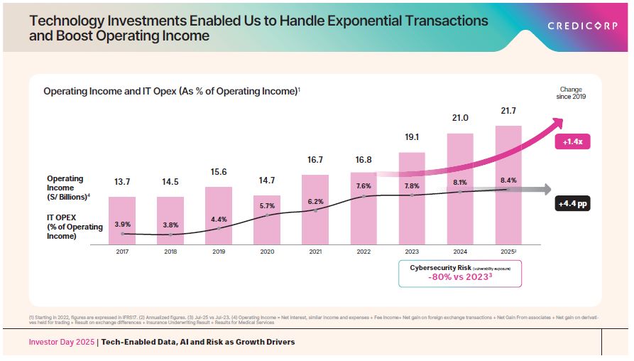 (1) Starting in 2022, figures are expressed in IFRS17. (2) Annualized figures. (3) Jul-25 vs Jul-23. (4) Operating Income = Net interest, similar income and expenses + Fee Income+ Net gain on foreign exchange transactions + Net Gain From associates + Net gain on derivati- ves held for trading + Result on exchange differences + Insurance Underwriting Result + Results for Medical Services  Operating Income and IT Opex (As % of Operating Income)1  2019  2018  2017  2020  2021  2022  13.7  14.5  15.6  14.7  16.7  16.8  19.1  21.7  21.0  3.9%  3.8%  4.4%  5.7%  6.2%  7.6%  7.8%  8.1%  8.4%  2023 2024 20252  Cybersecurity Risk (vulnerability exposure)  -80% vs 20233  Operating Income  (S/ Billions)4  IT OPEX  (% of Operating  Income)  +4.4 pp  Change  since 2019  +1.4x  Technology Investments Enabled Us to Handle Exponential Transactions and Boost Operating Income  Investor Day 2025 | Tech-Enabled Data, AI and Risk as Growth Drivers