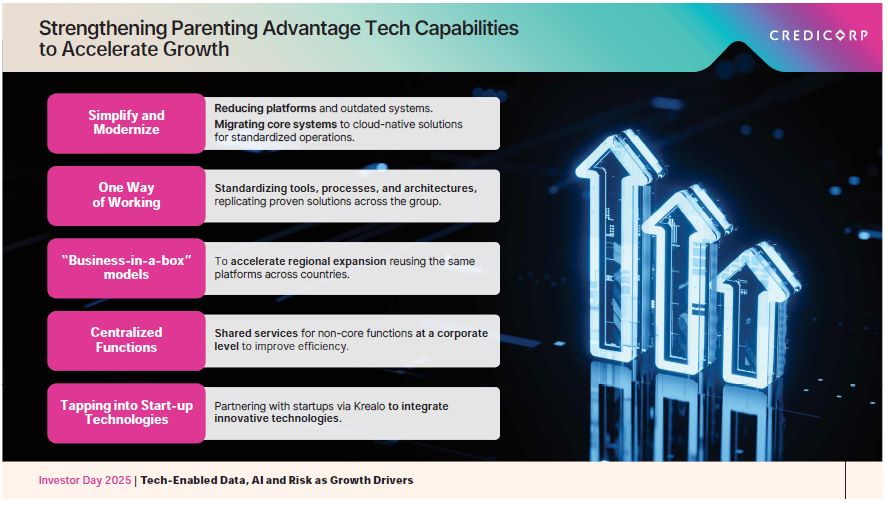 Reducing platforms and outdated systems.  Migrating core systems to cloud-native solutions for standardized operations.  Simplify and Modernize  Standardizing tools, processes, and architectures,  replicating proven solutions across the group.  One Way of Working  To accelerate regional expansion reusing the same platforms across countries.  “Business-in-a-box”  models  Shared services for non-core functions at a corporate level to improve efficiency.  Centralized Functions  Partnering with startups via Krealo to integrate innovative technologies.  Tapping into Start-up Technologies  Strengthening Parenting Advantage Tech Capabilities  to Accelerate Growth  Investor Day 2025 | Tech-Enabled Data, AI and Risk as Growth Drivers