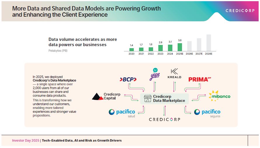 Data volume accelerates as more  data powers our businesses  Petabytes (PB)  2020 2021 2022 2023 2024 2025E  1.4  1.7  1.8  2.9  3.1  3.8  2026E  2027E  2028E  In 2025, we deployed Credicorpʼs Data Marketplace  — a single space where over  2,000 users from all of our businesses can share and consume data products.  This is transforming how we understand our customers, enabling more tailored experiences and stronger value propositions.  Credicorp  Data Marketplace  More Data and Shared Data Models are Powering Growth  and Enhancing the Client Experience  Investor Day 2025 | Tech-Enabled Data, AI and Risk as Growth Drivers
