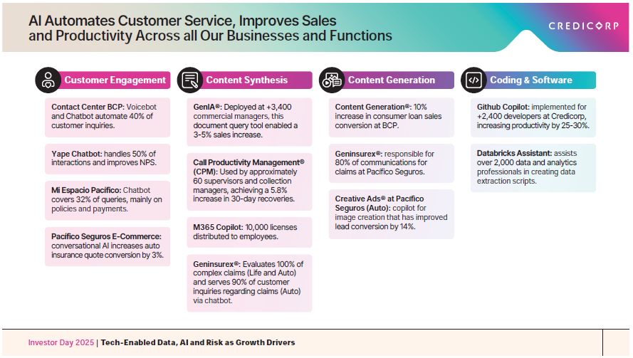 Customer Engagement  Contact Center BCP: Voicebot and Chatbot automate 40% of customer inquiries.  Pacífico Seguros E-Commerce: conversational AI increases auto insurance quote conversion by 3%.  Mi Espacio Pacífico: Chatbot covers 32% of queries, mainly on policies and payments.  Yape Chatbot: handles 50% of interactions and improves NPS.  Content Generation  Content Generation®: 10% increase in consumer loan sales conversion at BCP.  GenIA®: Deployed at +3,400 commercial managers, this document query tool enabled a 3-5% sales increase.  Creative Ads® at Pacífico Seguros (Auto): copilot for image creation that has improved lead conversion by 14%.  Geninsurex®: responsible for 80% of communications for claims at Pacífico Seguros.  Content Synthesis  M365 Copilot: 10,000 licenses distributed to employees.  Geninsurex®: Evaluates 100% of complex claims (Life and Auto) and serves 90% of customer inquiries regarding claims (Auto) via chatbot.  Call Productivity Management® (CPM): Used by approximately 60 supervisors and collection managers, achieving a 5.8% increase in 30-day recoveries.  Coding & Software  Databricks Assistant: assists over 2,000 data and analytics professionals in creating data extraction scripts.  Github Copilot: implemented for  +2,400 developers at Credicorp, increasing productivity by 25-30%.  AI Automates Customer Service, Improves Sales  and Productivity Across all Our Businesses and Functions  Investor Day 2025 | Tech-Enabled Data, AI and Risk as Growth Drivers