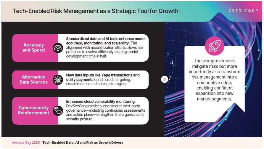 New data inputs like Yape transactions and utility payments enrich credit targeting, discrimination, and pricing strategies.  Standardized data and AI tools enhance model accuracy, monitoring, and scalability. This alignment with modernization efforts allows risk practices to evolve efficiently, cutting model development time in half.  Accuracy and Speed  Alternative Data Sources  Enhanced cloud vulnerability monitoring, DevSecOps practices, and stricter third-party governance—including continuous assessments and action plans—strengthen the organizationʼs security posture.  Cybersecurity Reinforcement  These improvements  mitigate risks but more  importantly also transform risk management into a  competitive edge, enabling confident expansion into new market segments.  Tech-Enabled Risk Management as a Strategic Tool for Growth  Investor Day 2025 | Tech-Enabled Data, AI and Risk as Growth Drivers
