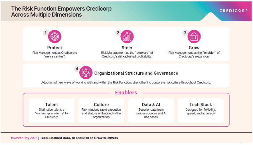 Talent  Distinctive talent, a “leadership academy” for Credicorp  Culture  Risk mindset, rapid execution and stature embedded in the organization  Data & AI  Superior data from various sources and AI use cases  Tech Stack  Designed for flexibility,  speed, and accuracy  4.  Organizational Structure and Governance  Adoption of new ways of working with and within the Risk Function, strengthening corporate risk culture throughout Credicorp.  Steer  Risk Management as the “steward” of  Credicorpʼs risk-adjusted profitability.  Protect  Risk Management as Credicorpʼs  “nerve center”.  Grow  Risk Management as the “enabler” of  Credicorpʼs expansion.  1.  3.  2.  Enablers  The Risk Function Empowers Credicorp Across Multiple Dimensions  Investor Day 2025 | Tech-Enabled Data, AI and Risk as Growth Drivers