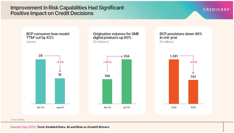 198  dec-24  356  jun-25  +80%  Origination volumes for SME digital products up 80%  (S/ millions)  1,381  1H24  742  1H25  -46%  BCP provisions down 46%  in one year  (S/ millions)  BCP consumer loan model TTM1 cut by 43%  (weeks)  28  dec-24  16  aug-25  -43%  (1) Time to Market.  Improvement in Risk Capabilities Had Significant Positive Impact on Credit Decisions  Investor Day 2025 | Tech-Enabled Data, AI and Risk as Growth Drivers