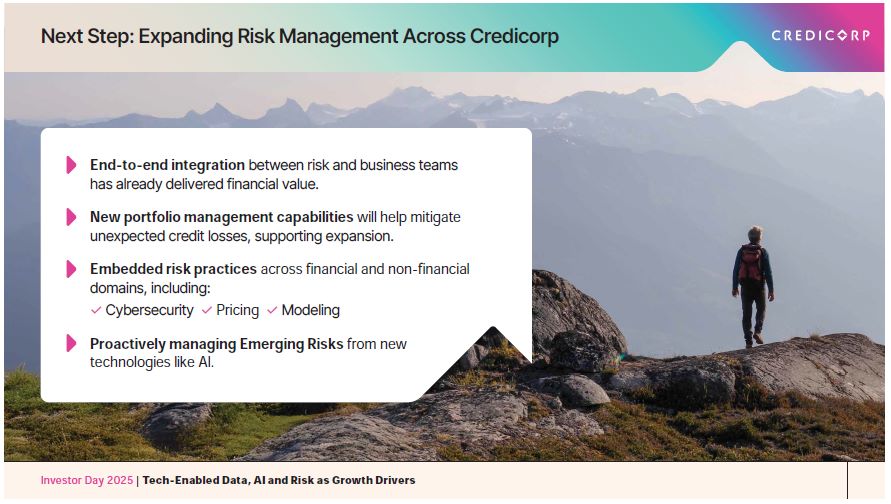 End-to-end integration between risk and business teams has already delivered financial value.  New portfolio management capabilities will help mitigate  unexpected credit losses, supporting expansion.  Embedded risk practices across financial and non-financial  domains, including:  Cybersecurity ✓ Pricing ✓ Modeling  Proactively managing Emerging Risks from new technologies like AI.  Next Step: Expanding Risk Management Across Credicorp  Investor Day 2025 | Tech-Enabled Data, AI and Risk as Growth Drivers