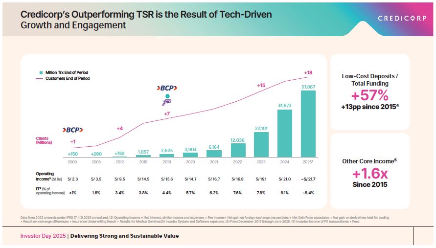 Credicorpʼs Outperforming TSR is the Result of Tech-Driven Growth and Engagement  Data from 2022 onwards under IFRS 17 | (1) 2025 annualized. (2) Operating Income = Net interest, similar income and expenses + Fee Income+ Net gain on foreign exchange transactions + Net Gain From associates + Net gain on derivatives held for trading  + Result on exchange differences + Insurance Underwriting Result + Results for Medical Services(3) Incudes System and Software expenses. (4) From December 2015 through June 2025. (5) Includes income of FX transactiones + Fees  Low-Cost Deposits / Total Funding  +57%  +13pp since 20154  57,867  41,673  22,101  12,036  6,164  3,904  2,625  Million Trx End of Period Customers End of Period  +150  +290  +750  1,857  2000  2006  2012  2018  2019  2020  2021  2022  2023  2024  20251  S/ 2.3  S/ 3.5  S/ 8.5  S/ 14.5  S/ 15.6  S/ 14.7  S/ 16.7  S/ 16.8  S/ 19.1  S/ 21.0  ~S/ 21.7  <1%  1.6%  3.4%  3.8%  4.4%  5.7%  6.2%  7.6%  7.8%  8.1%  ~8.4%  Operating Income2 (S/ Bn)  Clients (Millions)  IT3 (% of  operating income)  ~1  +4  +7  +15  +18  Other Core Income⁵  Investor Day 2025 | Delivering Strong and Sustainable Value  +1.6x  Since 2015