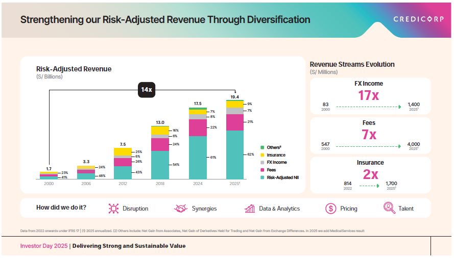 Data from 2022 onwards under IFRS 17 | (1) 2025 annualized. (2) Others include: Net Gain from Associates, Net Gain of Derivatives Held for Trading and Net Gain from Exchange Differences. In 2025 we add MedicalServices result  Revenue Streams Evolution  (S/ Millions)  FX Income  17x  83 1,400  2000 20251  Fees  7x  547 4,000  2000 20251  Insurance  2x  814   2022  1,700  20251  Others2 Insurance FX Income Fees  Risk-Adjusted NII  2000  20251  2024  2018  2006  2012  41%  23%  24%  48%  19.4  17.5  13.0  7.5  3.3  1.7  14x  Strengthening our Risk-Adjusted Revenue Through Diversification  Risk-Adjusted Revenue  (S/ Billions)  How did we do it?  Synergies  Data & Analytics  Pricing  Talent  Disruption  25%  Investor Day 2025 | Delivering Strong and Sustainable Value  6%  26%  43%  24%  54%  16%  6%  22%  61%  8%  7%  21%  62%  9%  7%