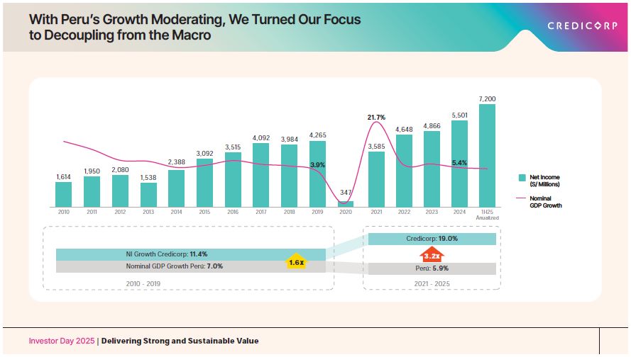 With Peruʼs Growth Moderating, We Turned Our Focus to Decoupling from the Macro  Net Income (S/ Millions)  Nominal GDP Growth  1,614  1,950  2,080  1,538  3,092  3,515  4,092  3,984  4,265  4,648  4,866  5,501  2010  2011  2012  2013  2014  2016  2017  347  2,388  2024  1H25  Anualized  2023  2022  2021  3,585  2015  2020  2019  2018  7,200  NI Growth Credicorp: 11.4%  Nominal GDP Growth Perú: 7.0%  Credicorp: 19.0%  Perú: 5.9%  2010 - 2019  3.2x  1.6x  21.7%  Investor Day 2025 | Delivering Strong and Sustainable Value  3.9%  5.4%  2021 - 2025