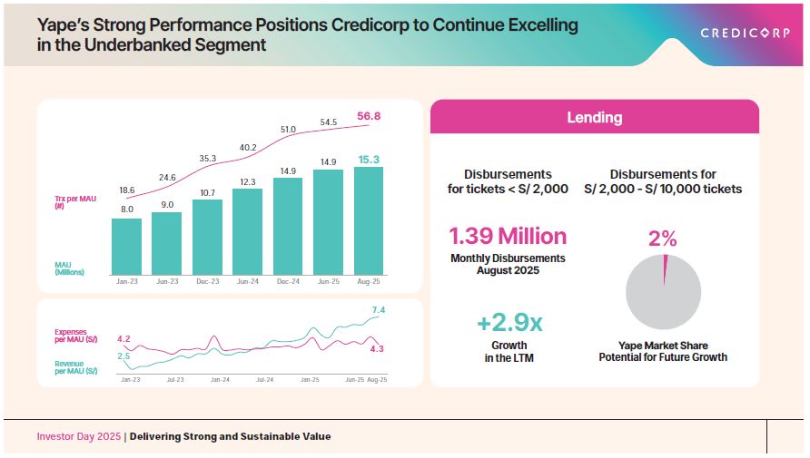 Yapeʼs Strong Performance Positions Credicorp to Continue Excelling in the Underbanked Segment  Lending  4.2  2.5  7.4  4.3  Disbursements  for tickets < S/ 2,000  Disbursements for  S/ 2,000 - S/ 10,000 tickets  +2.9x  Growth in the LTM  1.39 Million  Monthly Disbursements  August 2025  Yape Market Share  Potential for Future Growth  2%  Jun-23  Dec-23  Jun-24  Dec-24  Aug-25  Jun-25  Jan-23  15.3  14.9  14.9  12.3  10.7  9.0  8.0  56.8  54.5  51.0  40.2  35.3  24.6  18.6  MAU  (Millions)  Investor Day 2025 | Delivering Strong and Sustainable Value  Trx per MAU  (#)  Expenses  per MAU (S/)  Revenue  per MAU (S/)     Jan-23 Jul-23 Jan-24 Jul-24 Jan-25 Jun-25 Aug-25