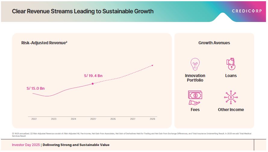 Clear Revenue Streams Leading to Sustainable Growth  Growth Avenues  Risk-Adjusted Revenue2  (1) 1H25 annualized. (2) Risk-Adjusted Revenue consist of: Risk-Adjusted NII, Fee Income, Net Gain from Associates, Net Gain of Derivatives Held for Trading and Net Gain from Exchange Differences, and Total Insurance Underwriting Result. In 2025 we add Total Medical Services Result  Innovation Portfolio  Fees  Loans  Other Income  2022  2023  2024  20251  2027  2028  2026  S/ 15.0 Bn  S/ 19.4 Bn  Investor Day 2025 | Delivering Strong and Sustainable Value
