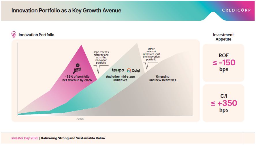 Innovation Portfolio as a Key Growth Avenue  ~2026  Yape reaches maturity and exits the innovation portfolio  Other relevant  initiatives exit  the innovation portfolio  ~81% of portfolio net revenue by 2026  Emerging  and new initiatives  And other mid-stage initiatives  Investment Appetite  ROE  ≤ -150  bps  C/I  ≤ +350  bps  Innovation Portfolio  Investor Day 2025 | Delivering Strong and Sustainable Value