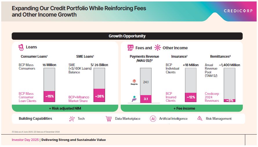 Expanding Our Credit Portfolio While Reinforcing Fees and Other Income Growth  Building Capabilities  Risk Management  Data Marketplace  Artificial Intelligence  AI  Tech  (1) Data as of June 2025. (2) Data as of December 2024  Payments Revenue  /MAU (S/)2  Insurance1  Remittances2  SME Loans1  BCP Mass Consumer Loan Clients  ~15%  Consumer Loans1  BCP Mass 16 Million  Consumers  Anual Revenue Pool (TAM S/)  Credicorp 2024  Revenues  ~3%  ~1,400 Million  BCP+Mibanco  Market Share  ~26%  SME S/ 26 Billion  (<S/ 60K Loans)  Balance  BCP  Individual Clients  BCP  Insured Clients  ~12%  +18 Million  + Risk adjusted NIM  + Fee income  Growth Opportunity  Loans  Fees and  Other Income  3.1  24.1  Investor Day 2025 | Delivering Strong and Sustainable Value