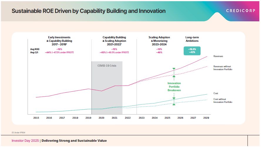Sustainable ROE Driven by Capability Building and Innovation  (1) Under IFRS4  COVID-19 Crisis  Avg ROE:  Avg C/I:  Early Investments & Capability Building  2017 - 20191  ~18%  ~44% (~47.5% under IFRS17)  Capability Building & Scaling Adoption 2021-20221  ~15%  ~45% (~48.5% under IFRS17)  Scaling Adoption & Monetizing 2023-2024  ~16%  ~46%  Revenues  Revenues without Innovation Portfolio  Cost  Cost without Innovation Portfolio  2017  2016  2015  2018  2019  2020  2021  2022  2023  2024  2025  2026  2027  2028  Long-term Ambitions  Innovation Portfolio Breakeven  ~19.5%  ~42%  Investor Day 2025 | Delivering Strong and Sustainable Value
