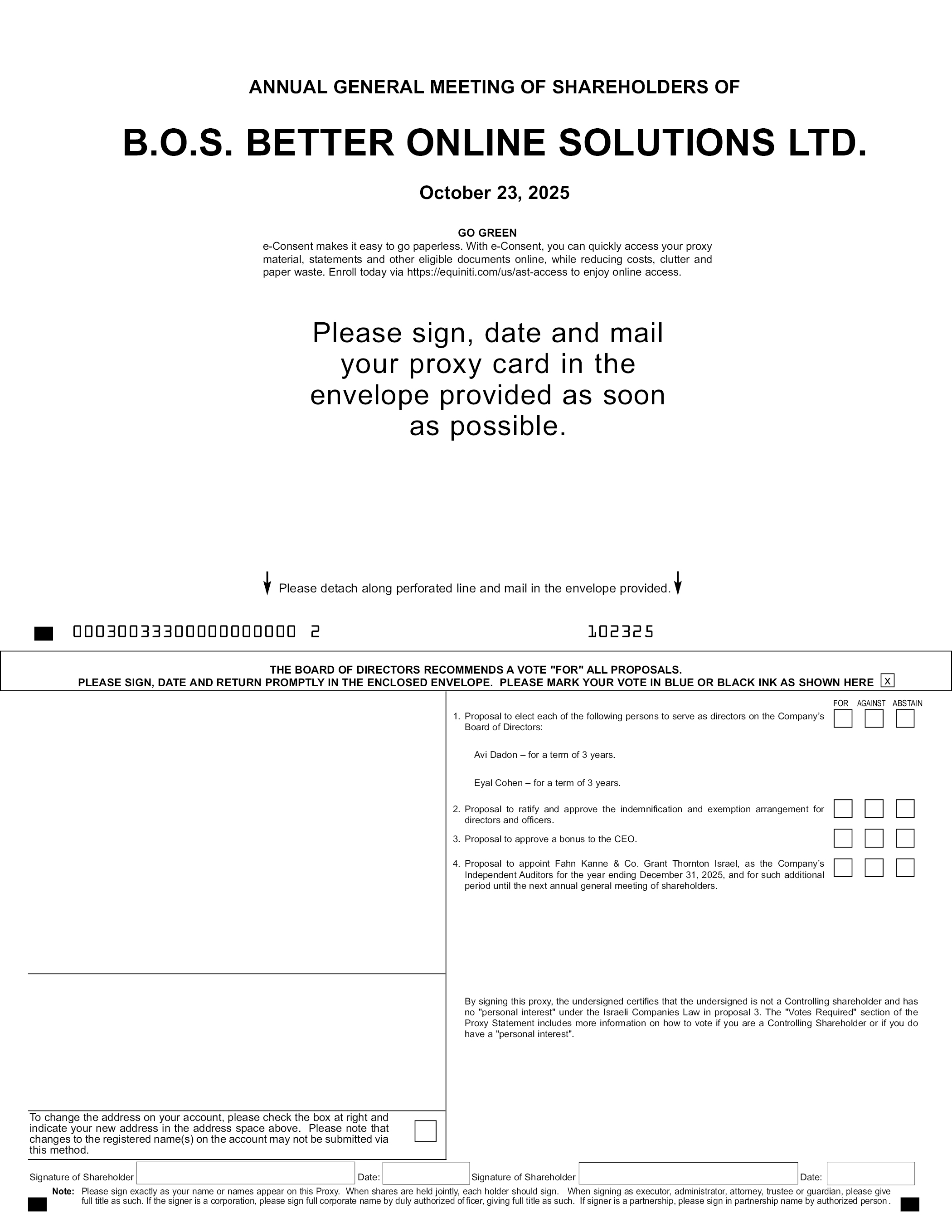 ANNUAL GENERAL MEETING OF SHAREHOLDERS OF B.O.S. BETTER ONLINE SOLUTIONS LTD. October 23, 2025 Please sign, date and mail your proxy card in the envelope provided as soon as possible. Please detach along perforated line and mail in the envelope provided.GO GREEN e-Consent makes it easy to go paperless. With e-Consent, you can quickly access your proxy material, statements and other eligible documents online, while reducing costs, clutter and paper waste. Enroll today via https://equiniti.com/us/ast-access to enjoy online access. Signature of Shareholder Date: Signature of Shareholder Date: Note: Please sign exactly as your name or names appear on this Proxy. When shares are held jointly, each holder should sign. When signing as executor, administrator, attorney, trustee or guardian, please give full title as such. If the signer is a corporation, please sign full corporate name by duly authorized officer, giving full title as such. If signer is a partnership, please sign in partnership name by authorized person. change the address on your account, please check the box at right and indicate your new address in the address space above. Please note that changes to the registered name(s) on the account may not be submitted via method. 1. Proposal to elect each of the following persons to serve as directors on the Company’s Board of Directors: Avi Dadon – for a term of 3 years. Eyal Cohen – for a term of 3 years. 2. Proposal to ratify and approve the indemnification and exemption arrangement for directors and officers. 3. Proposal to approve a bonus to the CEO. 4. Proposal to appoint Fahn Kanne & Co. Grant Thornton Israel, as the Company’s Independent Auditors for the year ending December 31, 2025, and for such additional period until the next annual general meeting of shareholders. By signing this proxy, the undersigned certifies that the undersigned is not a Controlling shareholder and has no “personal interest” under the Israeli Companies Law in proposal 3. The “Votes Required” section of the Proxy Statement includes more information on how to vote if you are a Controlling Shareholder or if you do have a “personal interest”. THE BOARD OF DIRECTORS RECOMMENDS A VOTE “FOR” ALL PROPOSALS. PLEASE SIGN, DATE AND RETURN PROMPTLY IN THE ENCLOSED ENVELOPE. PLEASE MARK YOUR VOTE IN BLUE OR BLACK INK AS SHOWN HERE x 00030033300000000000 2 102325 FOR AGAINST ABSTAIN