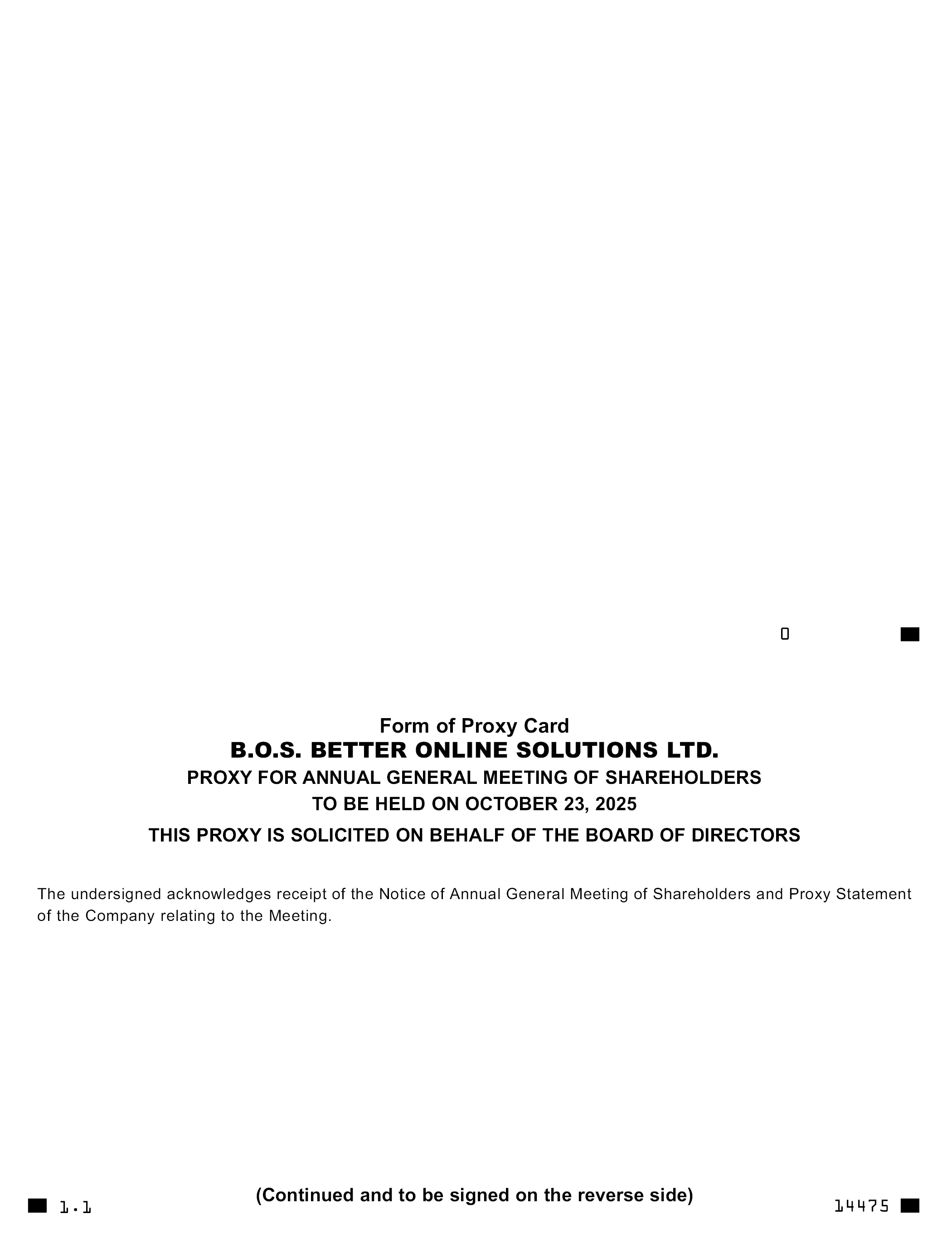 Form of Proxy Card B.O.S. BETTER ONLINE SOLUTIONS LTD. PROXY FOR ANNUAL GENERAL MEETING OF SHAREHOLDERS TO BE HELD ON OCTOBER 23, 2025 THIS PROXY IS SOLICITED ON BEHALF OF THE BOARD OF DIRECTORS The undersigned acknowledges receipt of the Notice of Annual General Meeting of Shareholders and Proxy Statement of the Company relating to the Meeting. 14475 (Continued and to be signed on the reverse side) 1.1