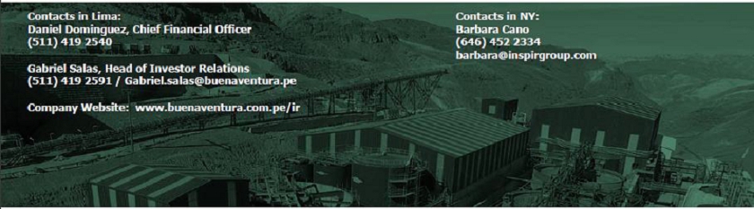 Lima, Peru, May 22, 2024 – Compañia de Minas Buenaventura S.A.A. (“Buenaventura” or “the Company”) (NYSE: BVN; Lima Stock Exchange: BUE.LM), Peru’s largest publicly-traded precious metals mining company, announces the voluntary temporary suspension of El Brocal’s processing plant facilities. Underground mining works at El Brocal continue uninterrupted per normal, with accumulated mined ore stockpiled for later processing, as has been previously provisioned and authorized, to be processed once concentrator plant operations have resumed.