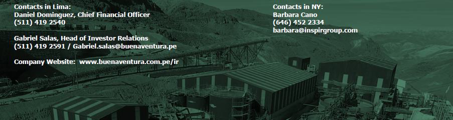 Lima, Peru, August 13, 2024 – Compañia de Minas Buenaventura S.A.A. (“Buenaventura” or “the Company”) (NYSE: BVN; Lima Stock Exchange: BUE.LM), Peru’s largest publicly-traded precious metals mining company, today announced that it has closed a transaction to sell to a subsidiary of Franco-Nevada Corporation 100% of Chaupiloma Dos de Cajamarca (“Chaupiloma”), Buenaventura’s subsidiary that owns 1.8% net smelter return royalty on all minerals (the “Royalty”) covering Newmont Corporation’s Yanacocha mine and adjacent mineral properties located in Peru.
